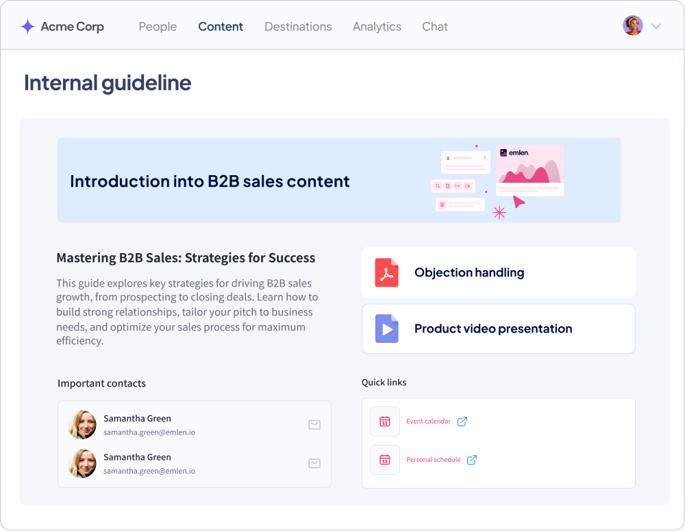 Organize internal information for your sales team —from product descriptions and battle cards to important contacts. Everything they need for customer conversations, in one place.